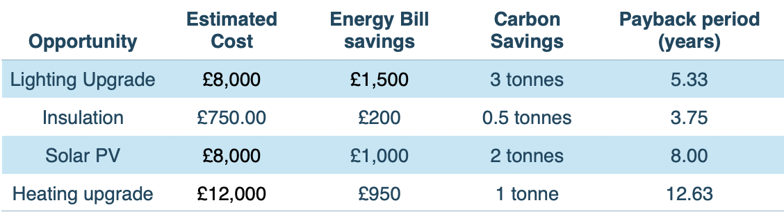 Once we have visited site and carried out the audit, we will prepare a detailed report with an executive summary highlighting the key recommendations, their estimated cost and their forecasted energy/cost savings. The report also contains further technical advice and information for your consideration and we can also support you with a grant to help fund energy saving opportunities. Here is an example of the recommendations and their benefits that a report may include: